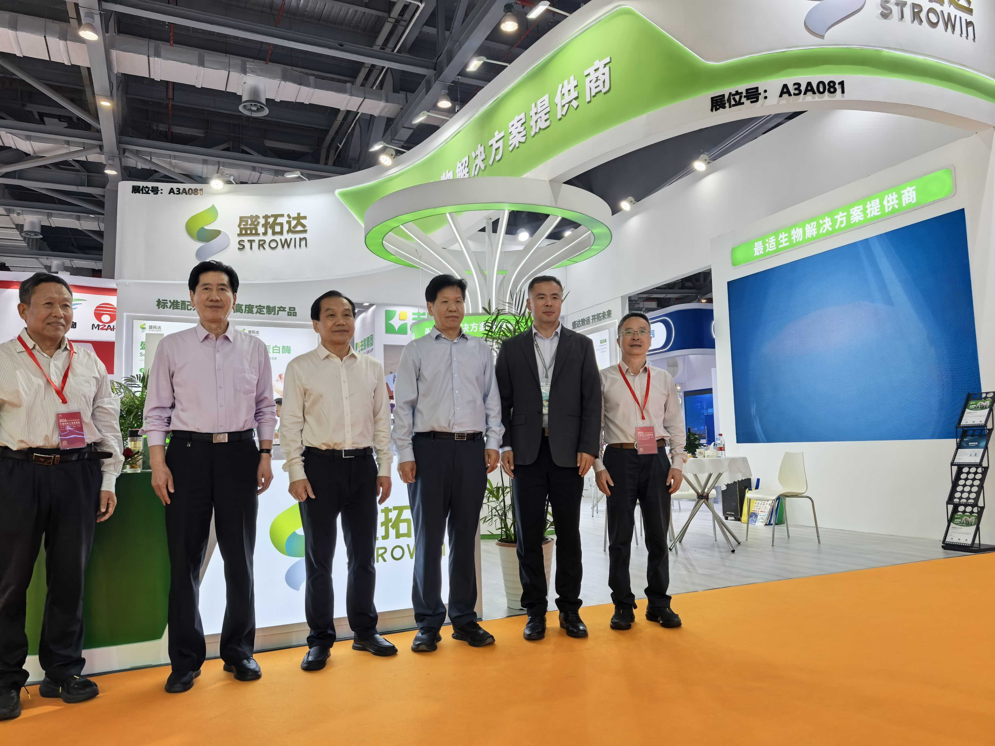 巡馆环节,行业领导一行莅临盛拓达展位指导,盛拓达集团张广民博士代表公司介绍了盛拓达集团最新成果,通过饲用酶制剂实现畜禽饲料降能50kcal/kg、减豆粕25kg/t的增效降本方案及国内外应用情况。